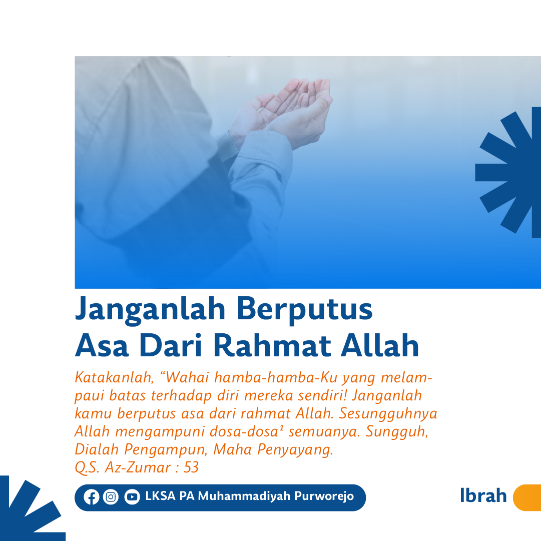 Katakanlah, “Wahai hamba-hamba-Ku yang melampaui batas terhadap diri mereka sendiri! Janganlah kamu berputus asa dari rahmat Allah. Sesungguhnya Allah mengampuni dosa-dosa¹ semuanya. Sungguh, Dialah Pengampun, Maha Penyayang. Q.S. Az-Zumar : 53
